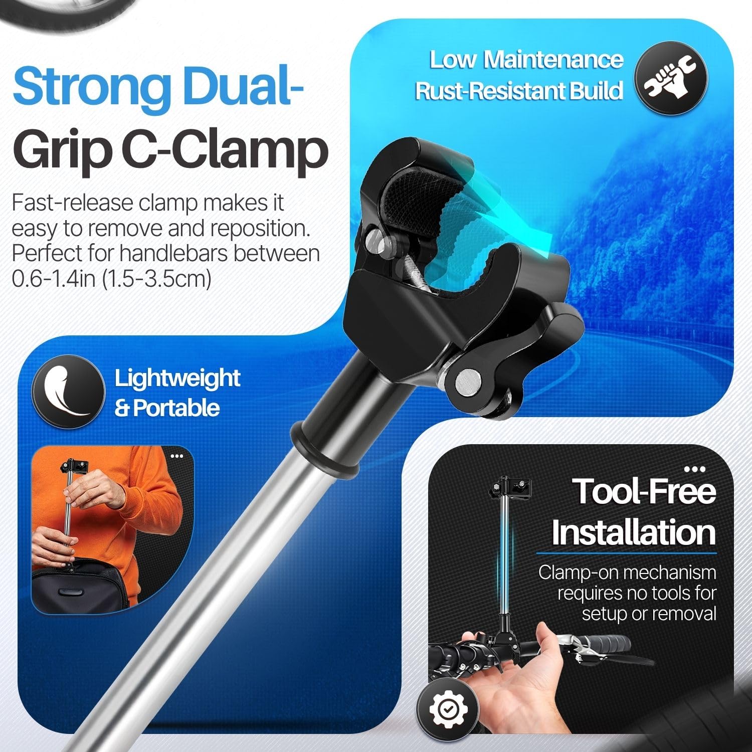 - Easy to Use and Install - Free your hands while riding your bike or going out. It gives you more focus on riding and increase your security. This umbrella mount stand has a innovative simple design. It allows easy installation and uninstall from handlebars without tools. Mount height is adjustable