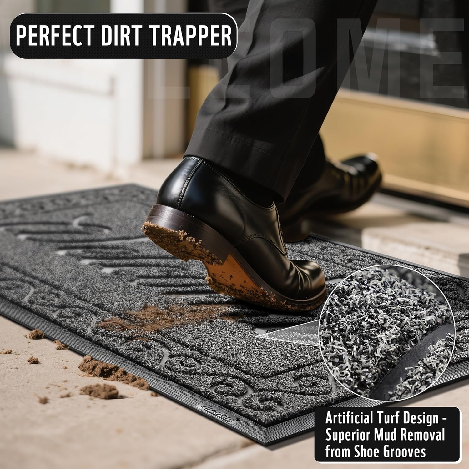 - 【Perfect Dirt Trapper】: Yimobra welcome mat surface is made of high-quality artificial grass, compared to other common materials, this can be more effective in trapping dirt, dust, mud, sand, or other debris and preventing them from entering the room, thus keeping your home clean and tidy. The Sturdy rubberized beveled edges also trap water, preventing excess water from splashing onto the floor!