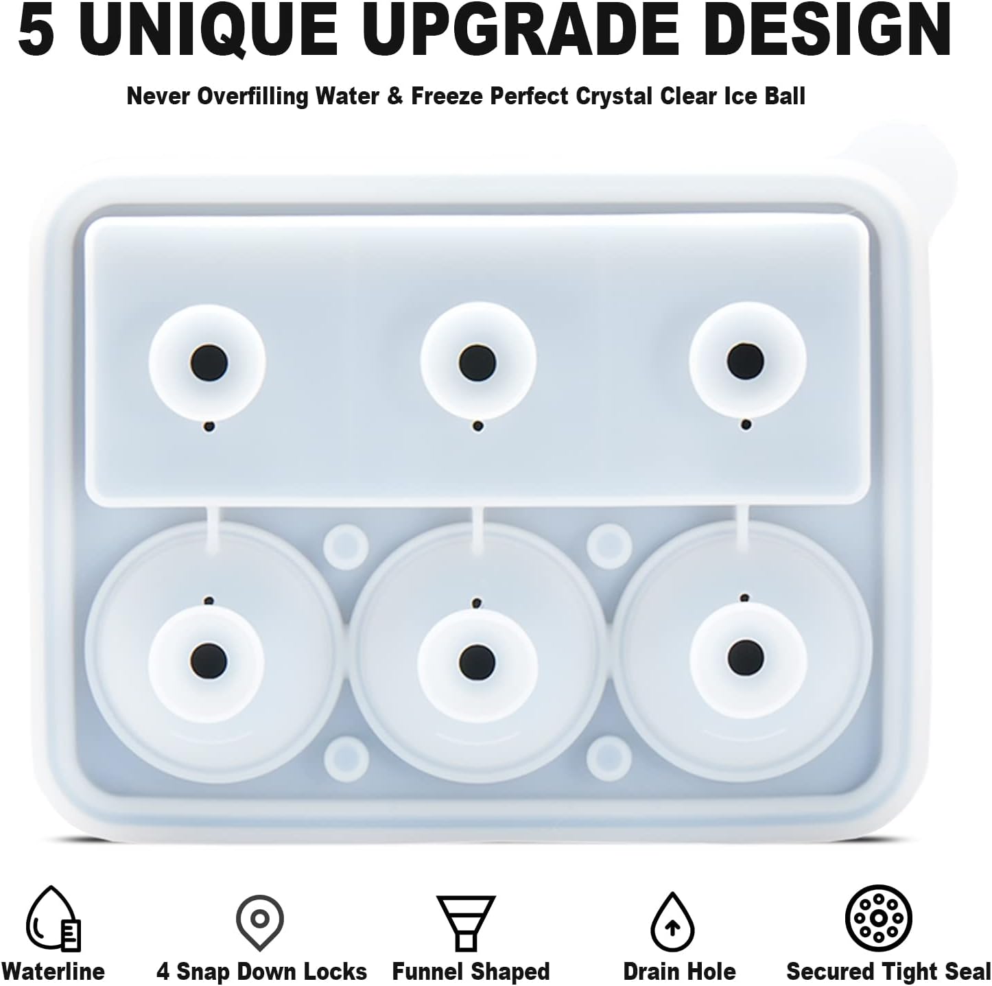 - đ„ăUnique Upgated Design To Prevent OverfillingăYou will never over filling water with this ice cube mold as the unique waterline and drain hole design. Just filling water by the SIX funnel shaped holes of the lid directly, no measuring cup required, no wonderings, you can get crystal clear ice balls and ice cubes easily with this ice cube molds for cocktails.