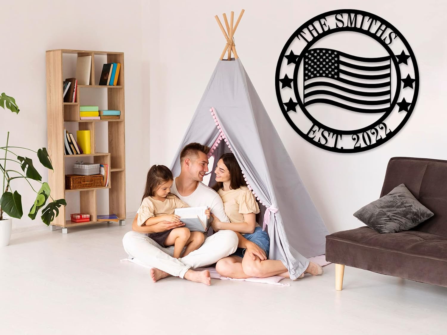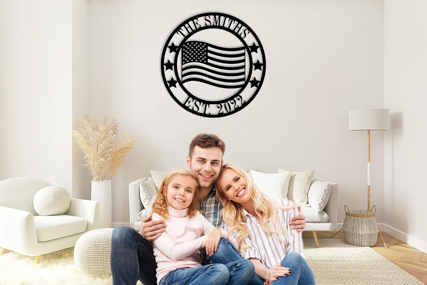 - Personalized touch your home: our metal American flag signs provide your home with a traditional and personalized touch full of emotion, love and memory. The metal sign can be customized according to your last name, first name and date of establishment. This last name sign will be treasured by your family for many years. You can also customize blessings to bring good luck to your family. Personalized family logo will add rural elegance to the wall.