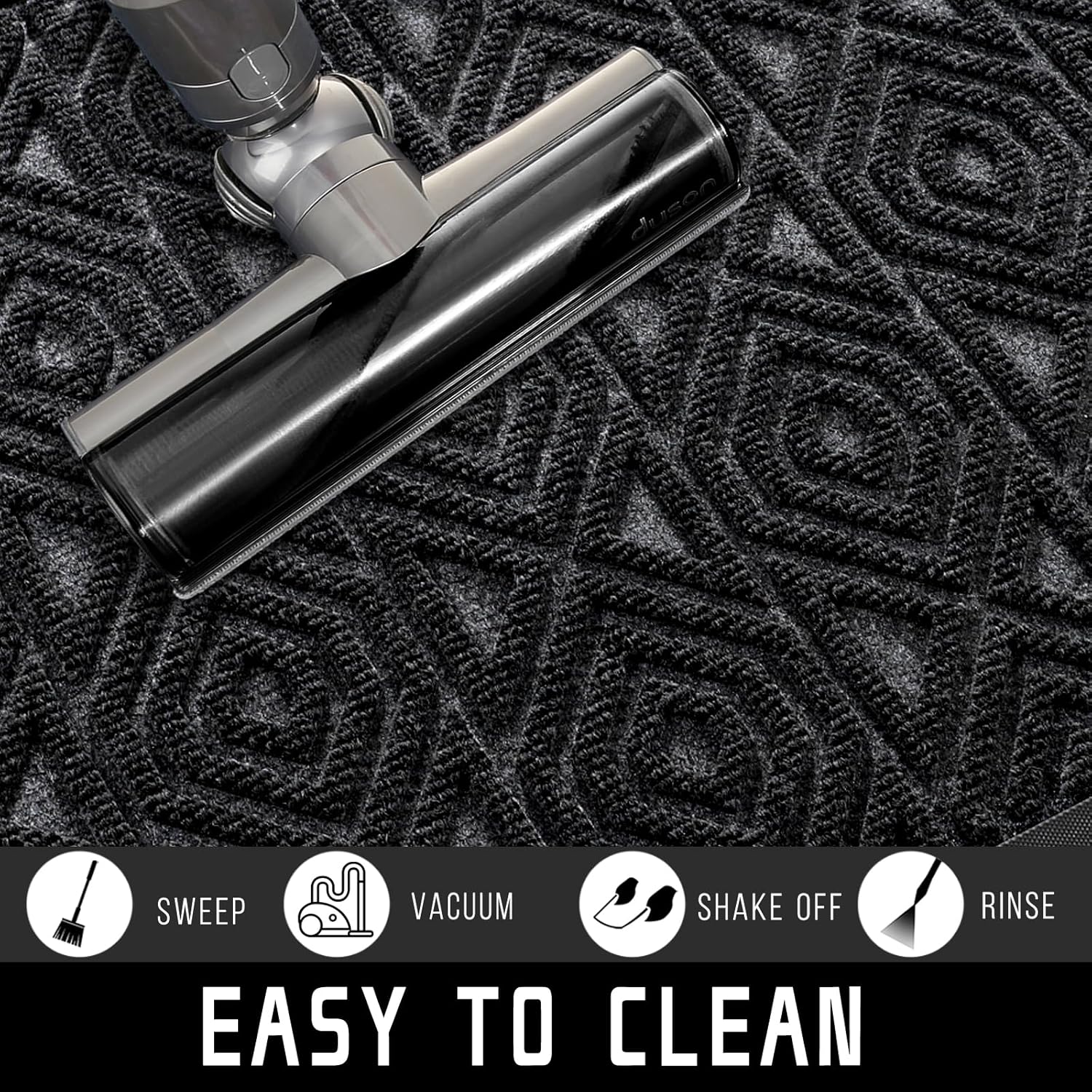- [CAPTURE DIRT AND MOISTURE] Yimobra front door entryway mat outdoor with unique pattern design, forming a detention dam extending in all directions, helping to capture dirt, dust, gravel, mud, sand, grass or other messy debris and prevent them from entering Indoor; The surface of floor mat beautifully woven polyester fabric absorbs moisture, and the sturdy oblique rubber edge will not accumulate water in rainy and snowy days, keeping your home dry and clean