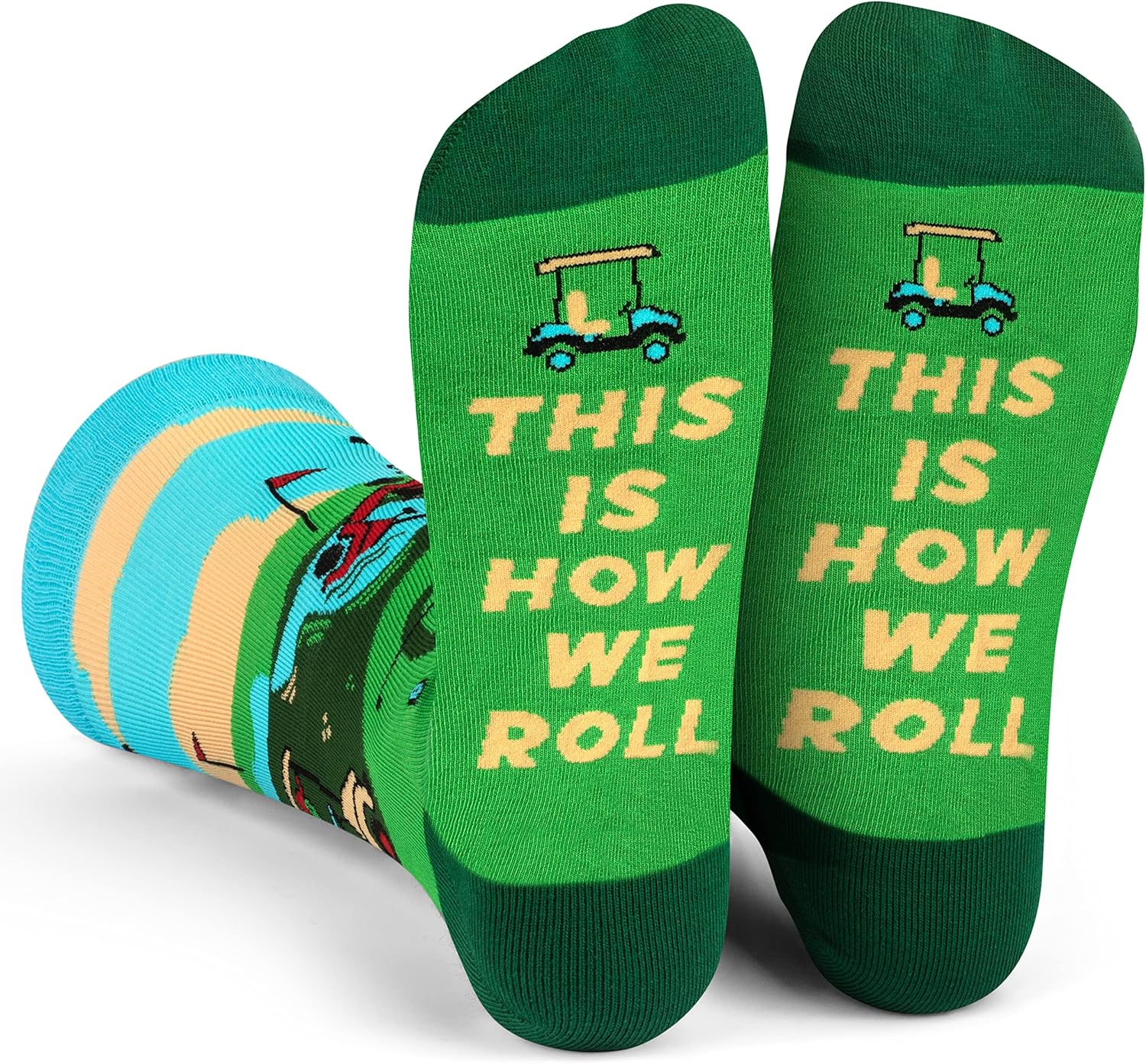 - This Is How Golfers Roll - These hilarious socks feature a rolling golf cart design that’s perfect for guys who love cruising the course in style.