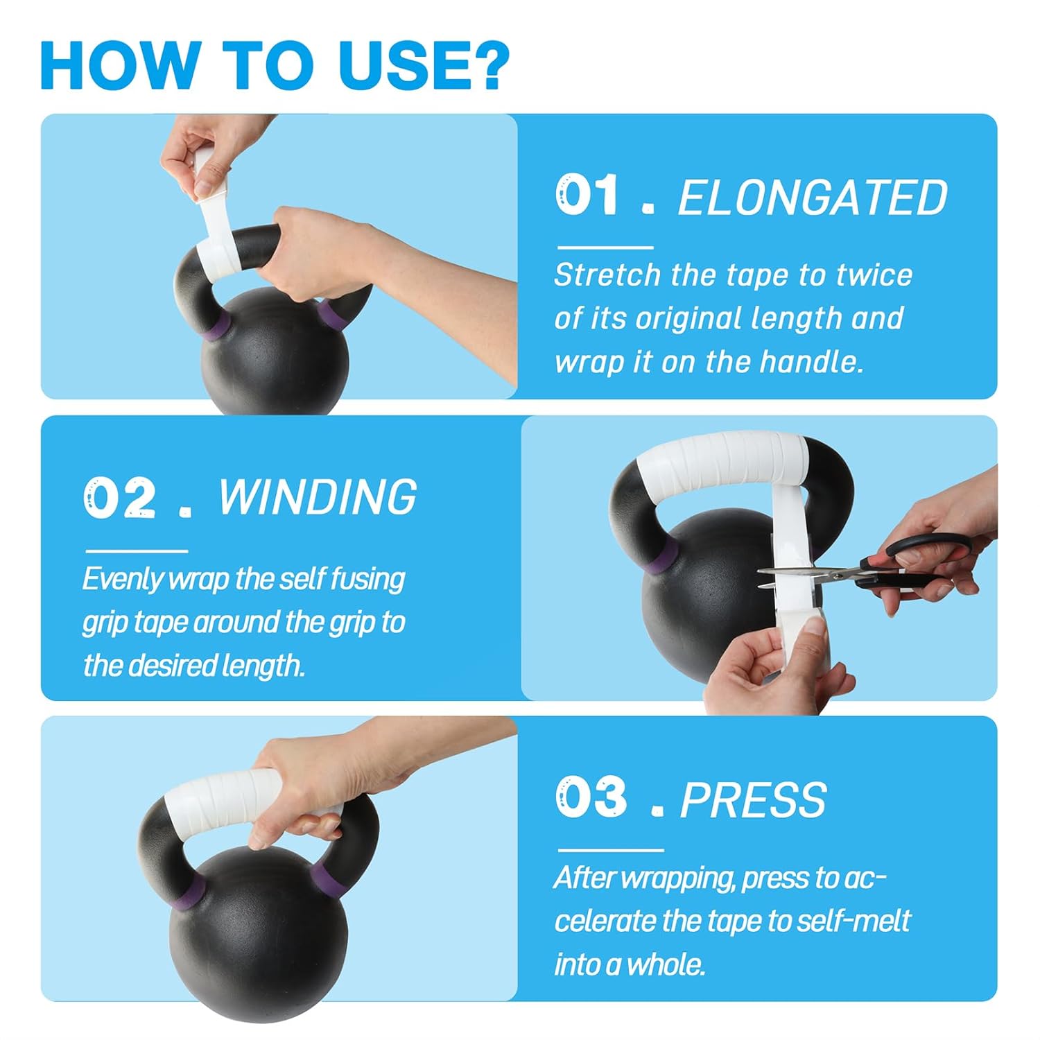 - NO GLUE: The self-melting silicone tape has no adhesive and can sticks to itself, forming a sealed whole. Proper stretching will help increase the pressure and allow the tape to self-fuse better. After a long time of use, the grip wrap tape will not leave any glue on the handle and on your hands.