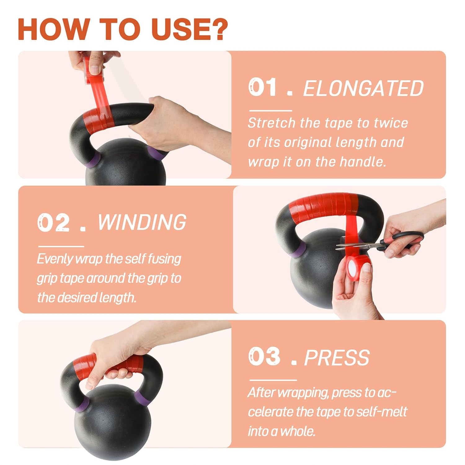 - NO GLUE: The self-melting silicone tape has no adhesive and can sticks to itself, forming a sealed whole. Proper stretching will help increase the pressure and allow the tape to self-fuse better. After a long time of use, the grip wrap tape will not leave any glue on the handle and on your hands.