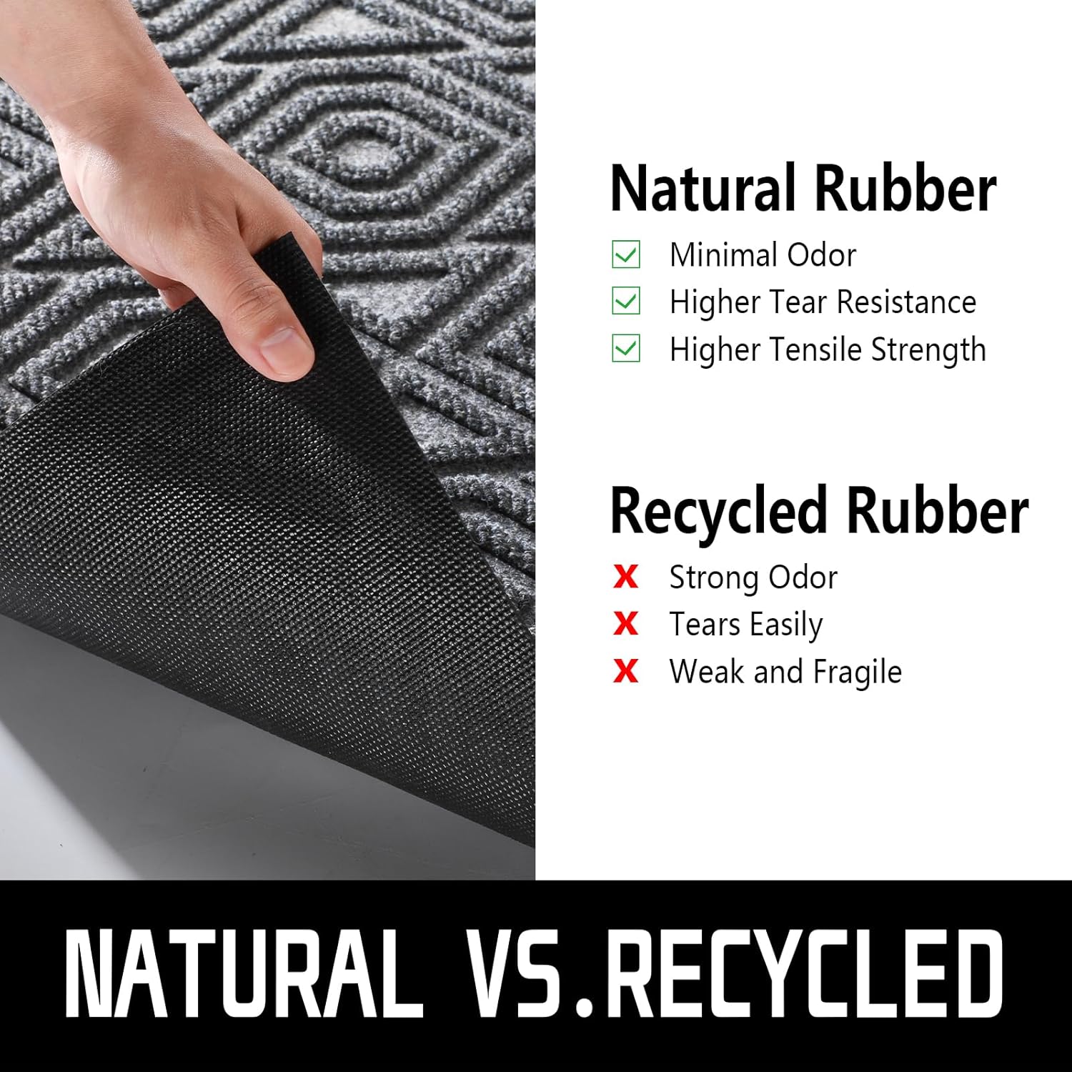 - [CAPTURE DIRT AND MOISTURE] Yimobra front door entryway mat outdoor with unique pattern design, forming a detention dam extending in all directions, helping to capture dirt, dust, gravel, mud, sand, grass or other messy debris and prevent them from entering Indoor; The surface of floor mat beautifully woven polyester fabric absorbs moisture, and the sturdy oblique rubber edge will not accumulate water in rainy and snowy days, keeping your home dry and clean