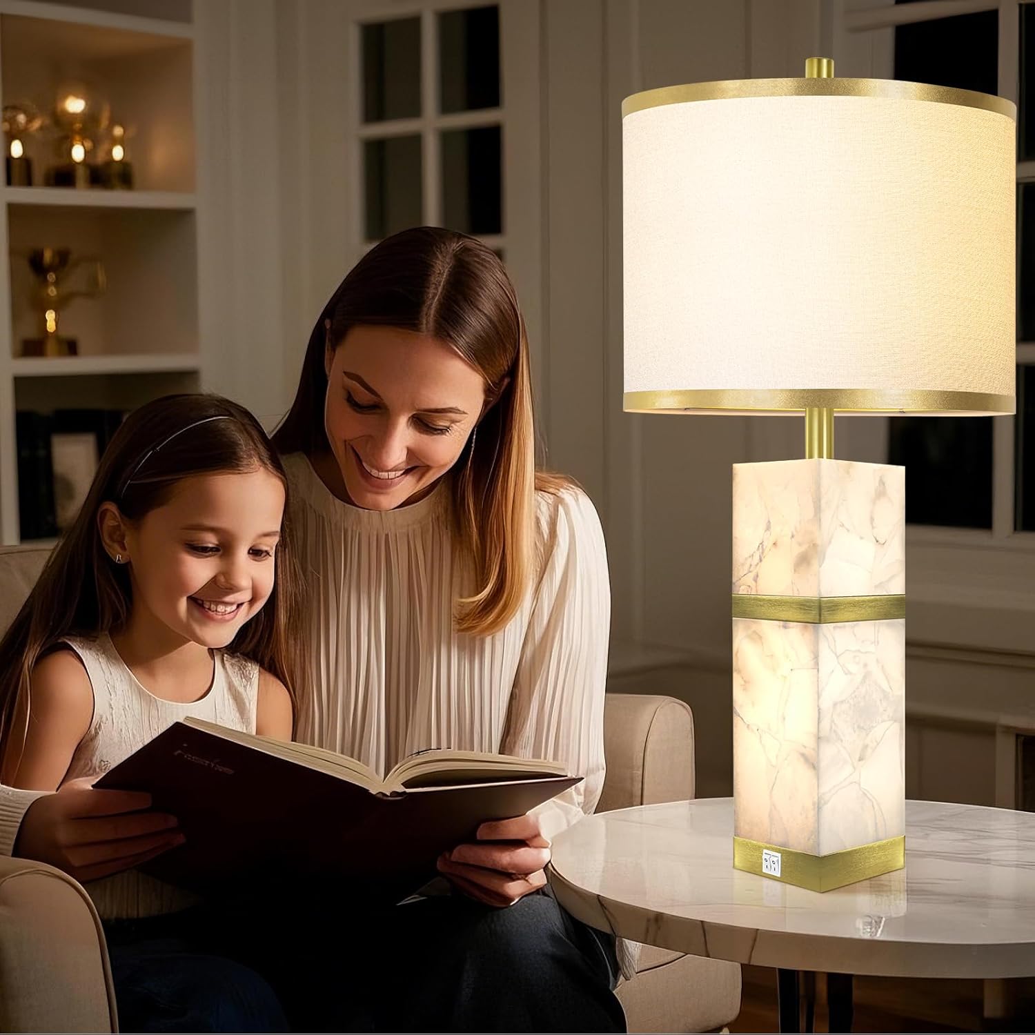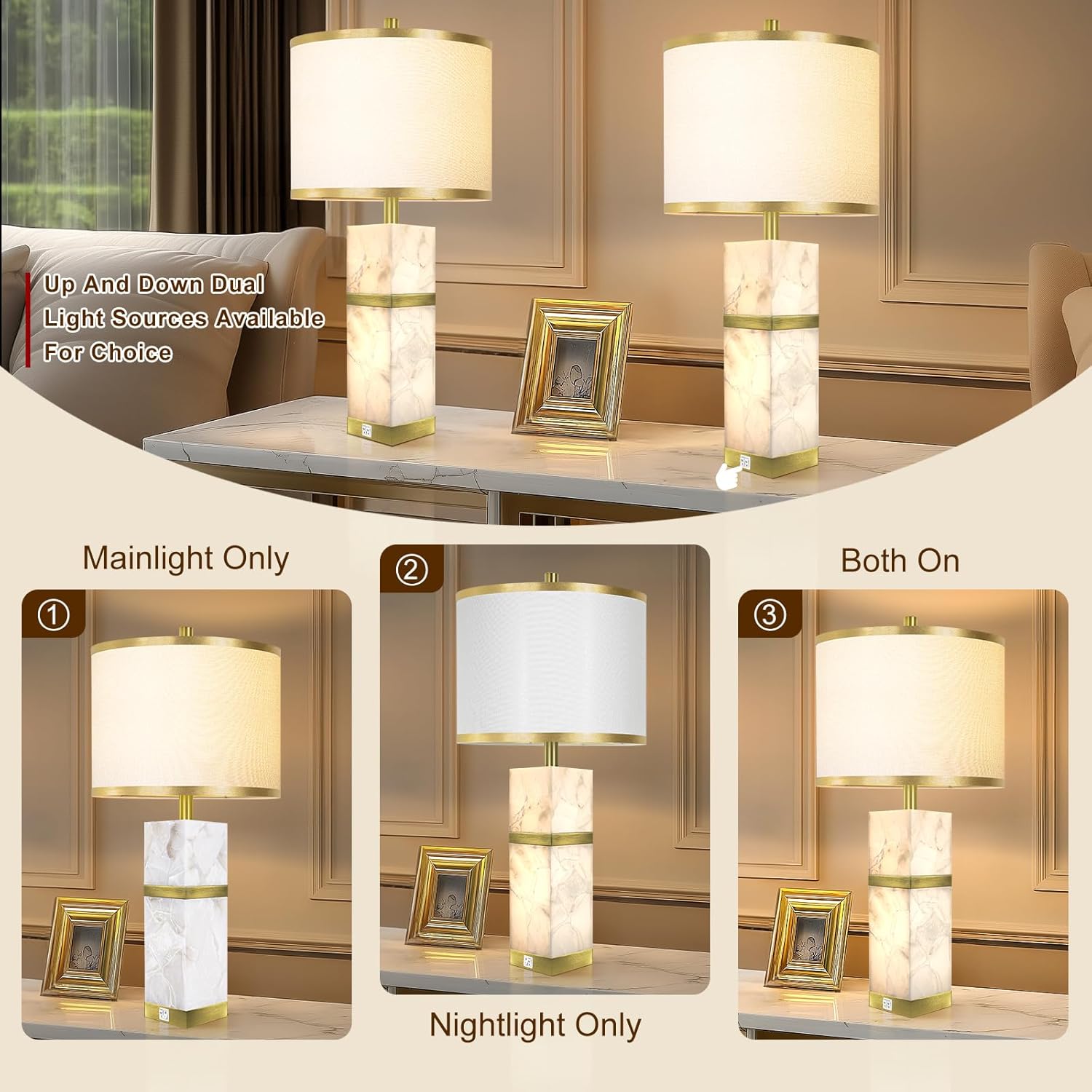 Natural Alabaster Table Lamps Set of 2 - Table Lamp with Night Light for Bedroom,Nightstand Lamps with USB Ports,Bedside Lamps with Linen Fabric Shade for Living Room,Bedroom,Office,Bar(Bulb Included)