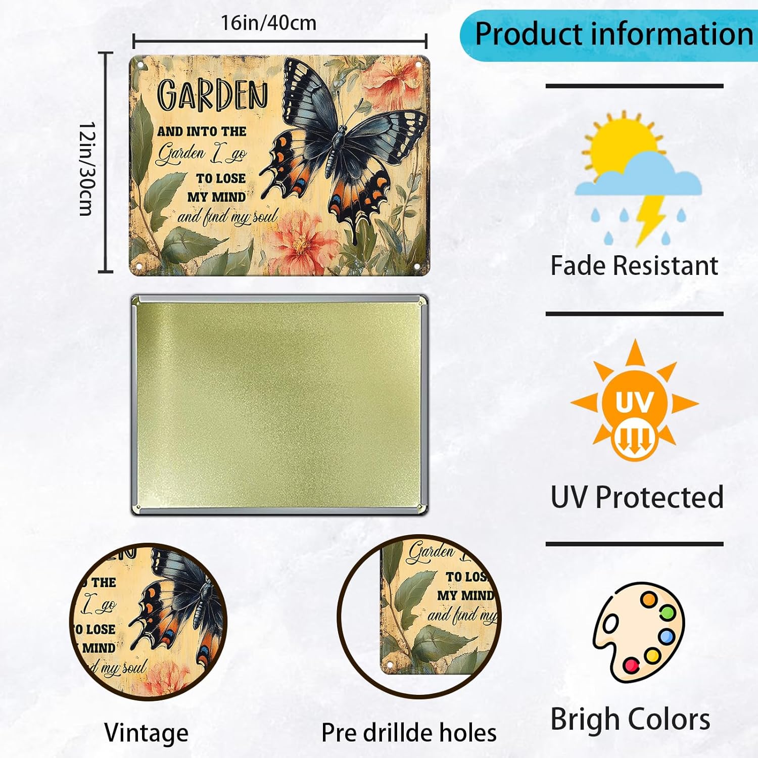 - Material:All Tin Made, Bright Colors, Weather-Resist, Durable, No Fade and Incredibly Lightweight.
