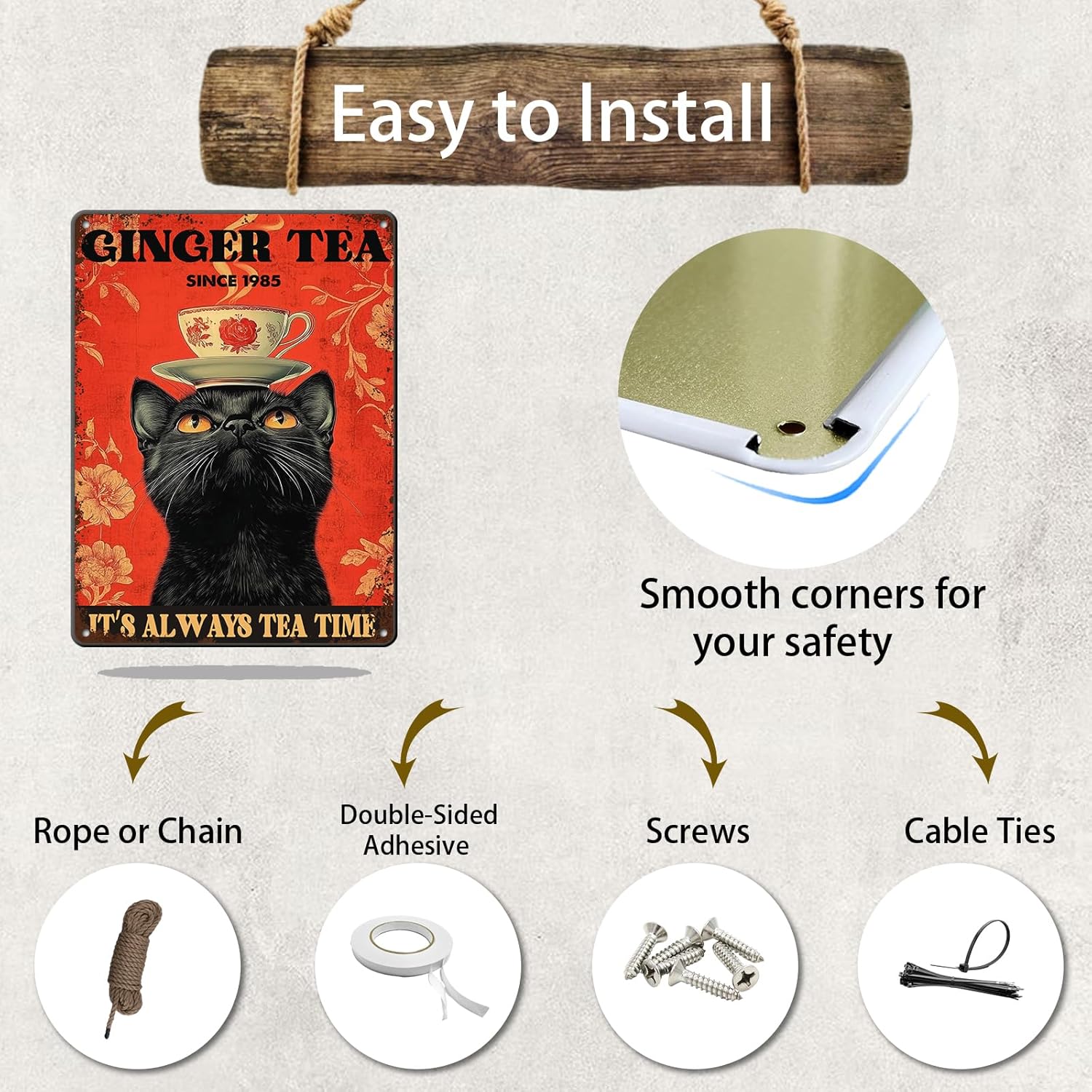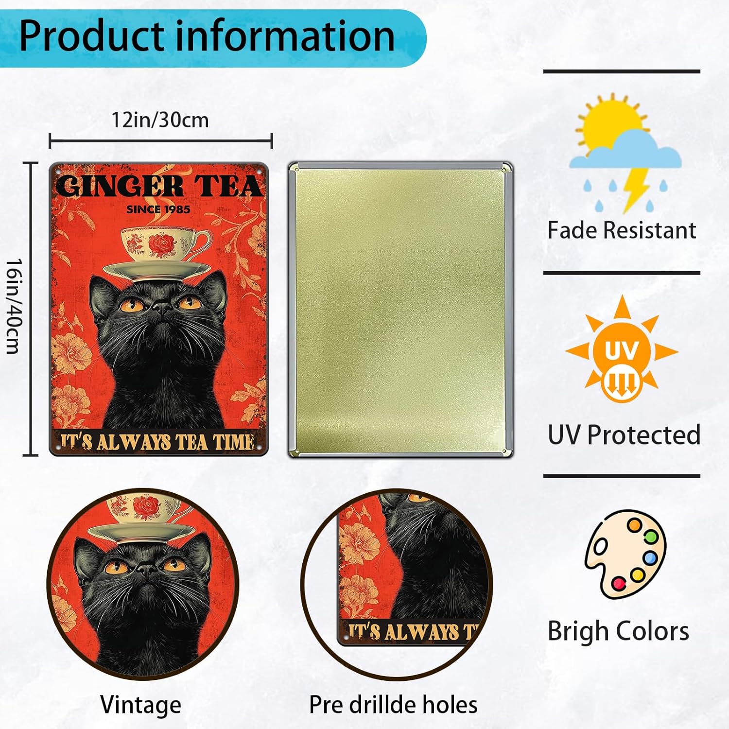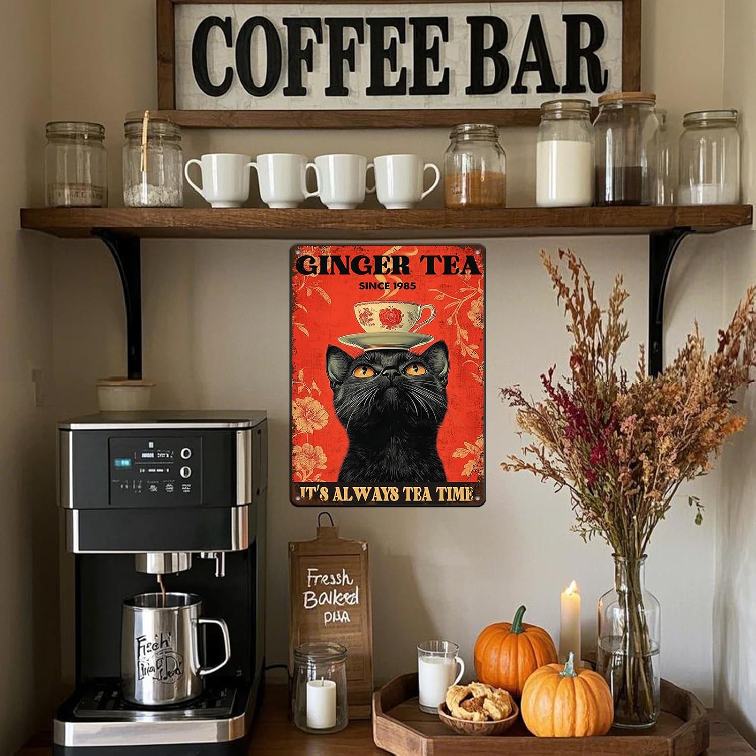 Funny Black Cat Tin Sign Ginger Tea It'S Always Tea Time Metal Sign Wall Decor For Home Cafe Bar Kitchen Poster 12x16 Inch