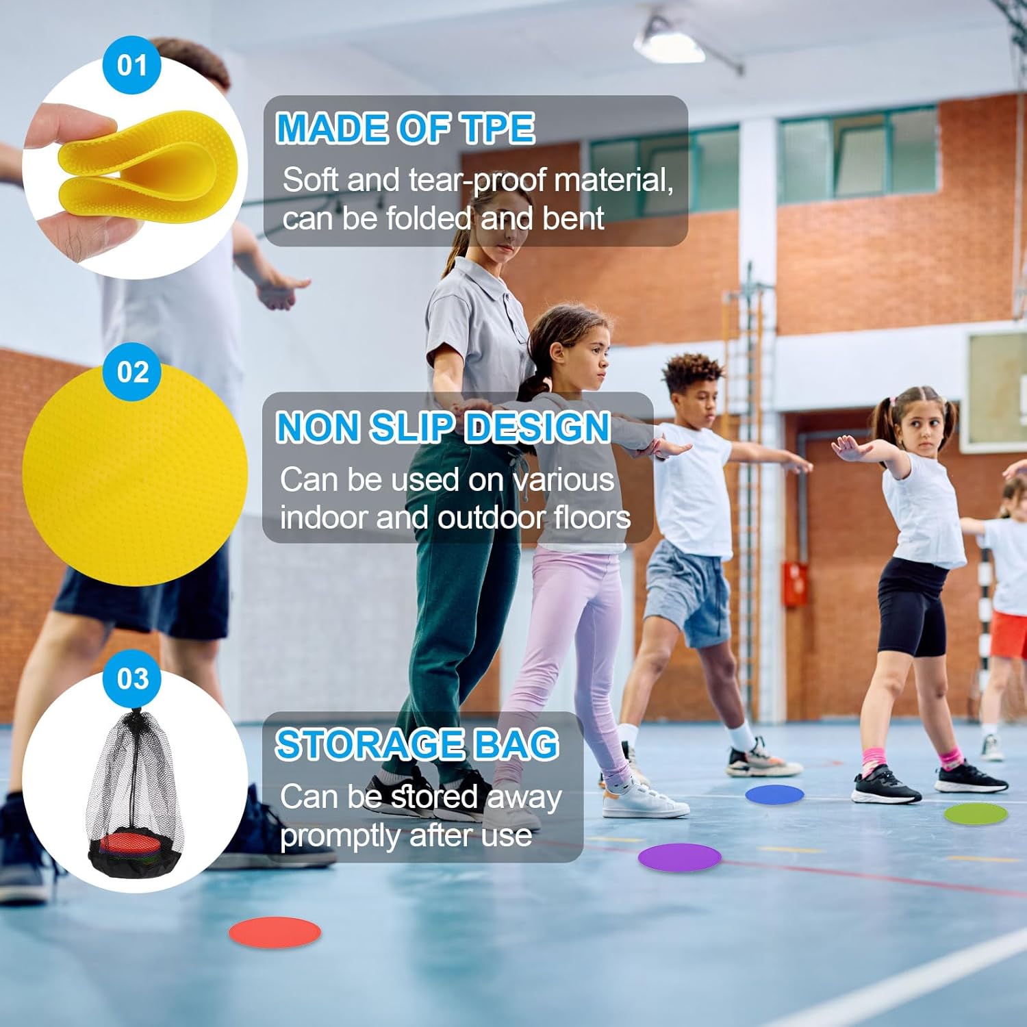 - Application: These poly spot markers are often used in homes, classrooms, playgrounds, and dance studios. They are convenient training accessories for agility training, sports training, fixed-point sitting, color tracking, classroom games, dance, sports, etc