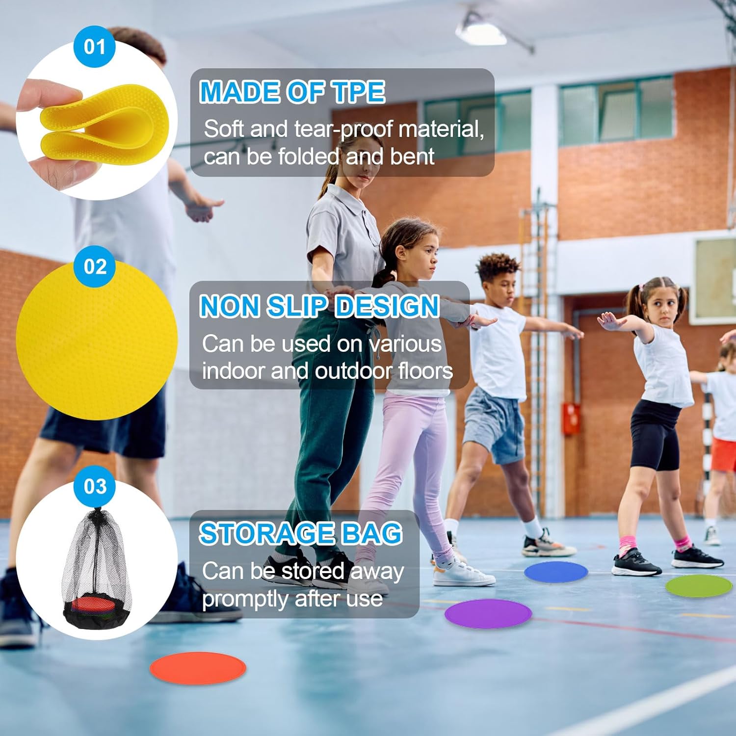 - Application: These poly spot markers are often used in homes, classrooms, playgrounds, and dance studios. They are convenient training accessories for agility training, sports training, fixed-point sitting, color tracking, classroom games, dance, sports, etc