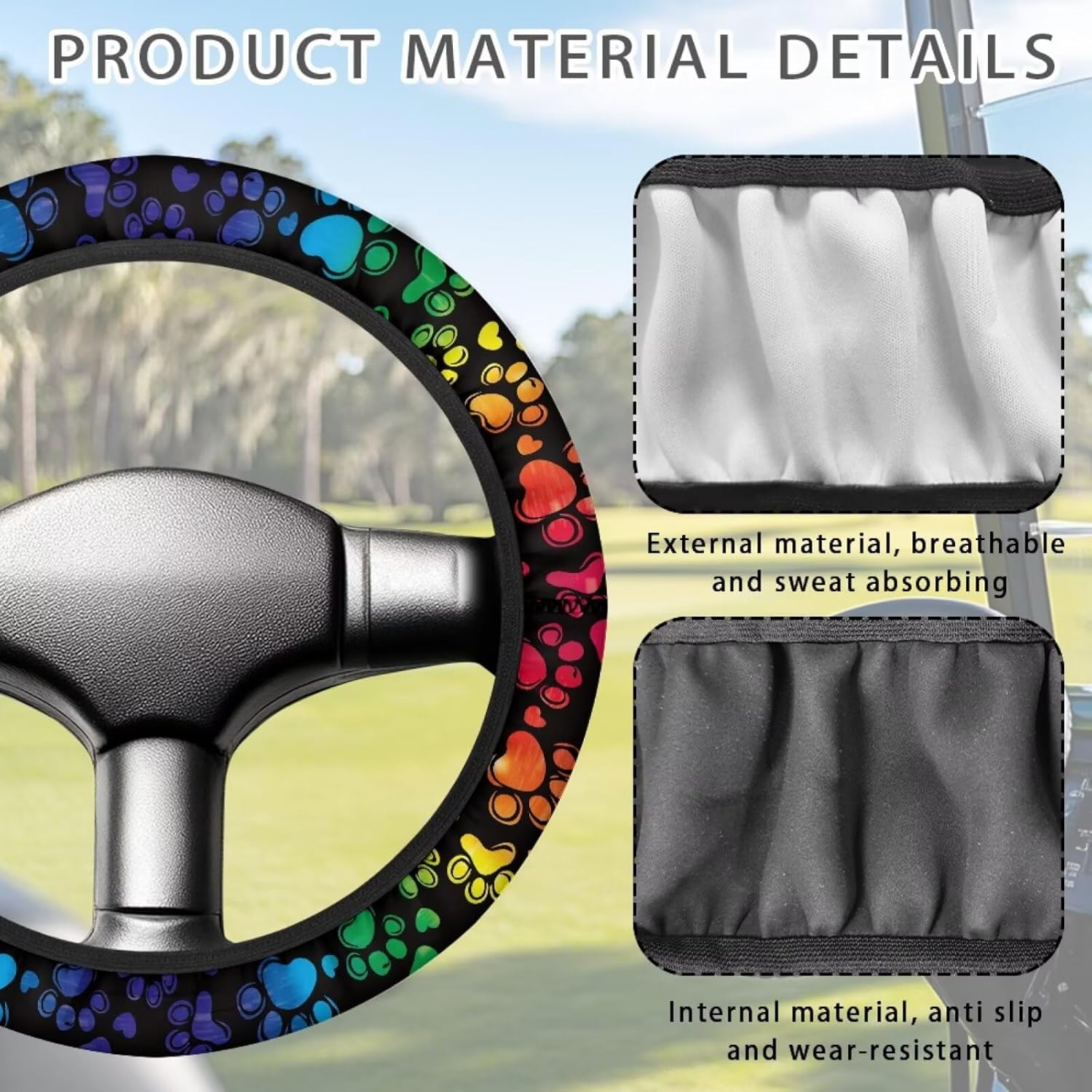 - Features: Golf cart steering wheel cover has a non-slip surface, a better grip on the steering wheel allows you to better control the vehicle, heat insulation, reflection of sunlight, cooling effect