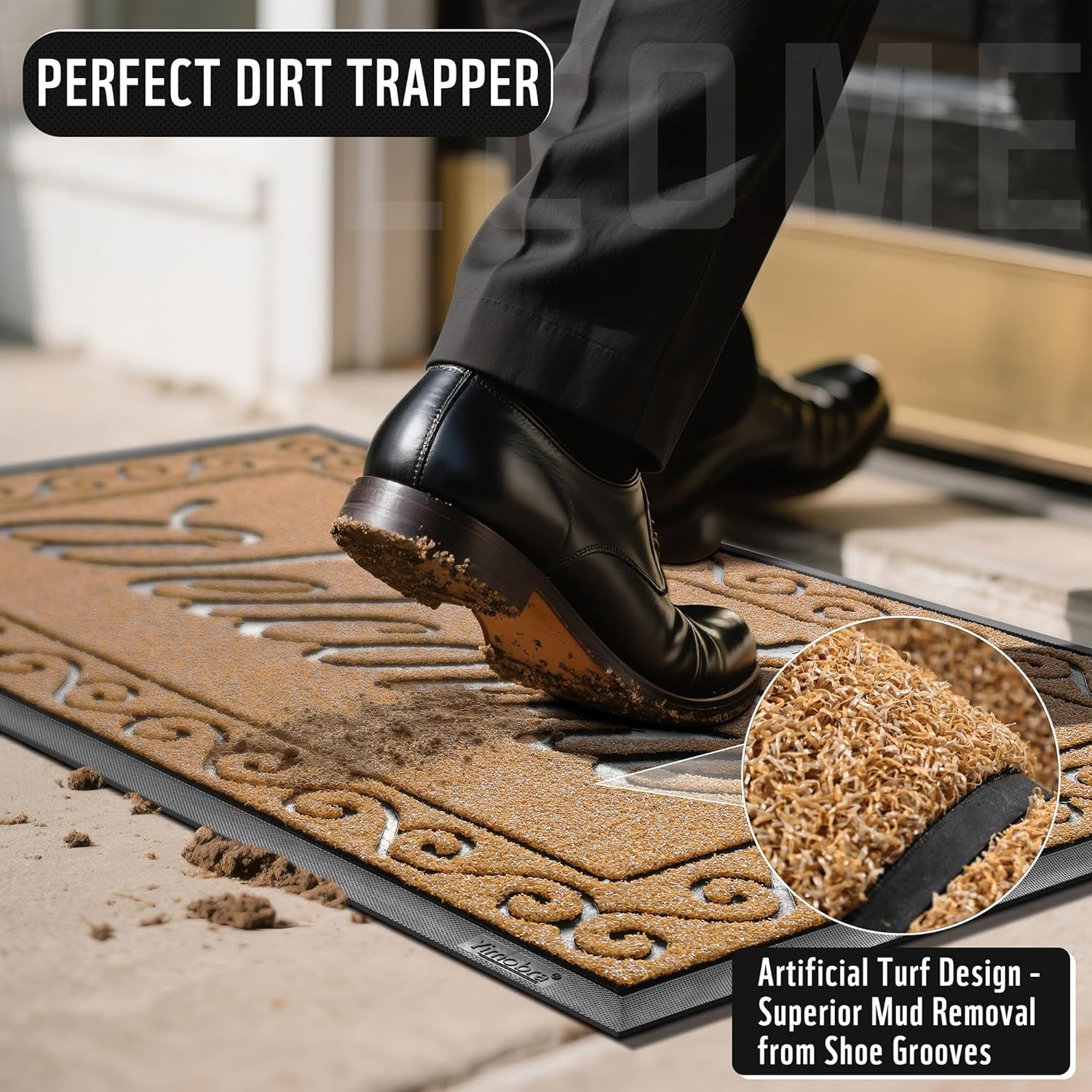 - 【Perfect Dirt Trapper】: Yimobra welcome mat surface is made of high-quality artificial grass, compared to other common materials, this can be more effective in trapping dirt, dust, mud, sand, or other debris and preventing them from entering the room, thus keeping your home clean and tidy. The Sturdy rubberized beveled edges also trap water, preventing excess water from splashing onto the floor!