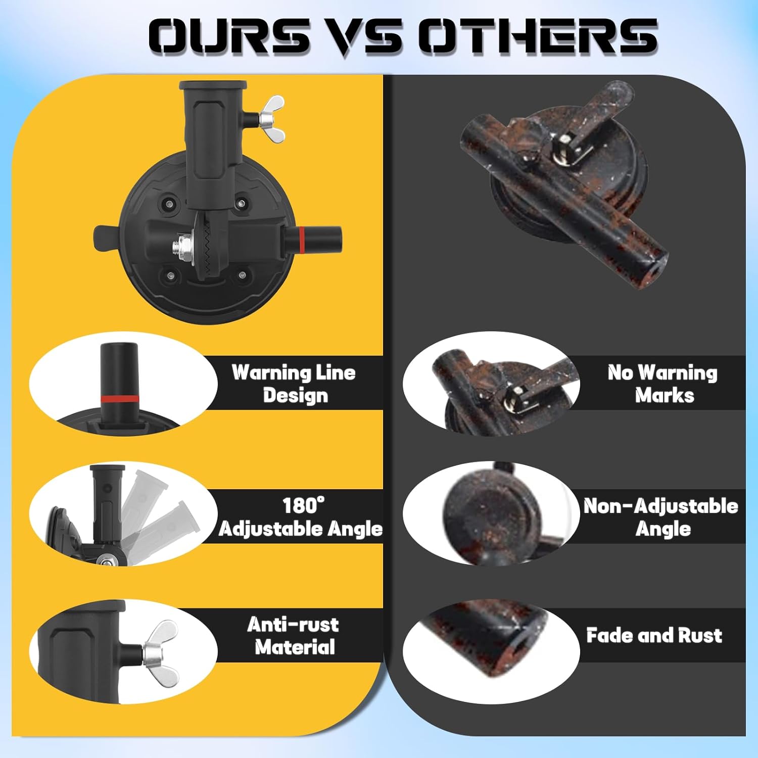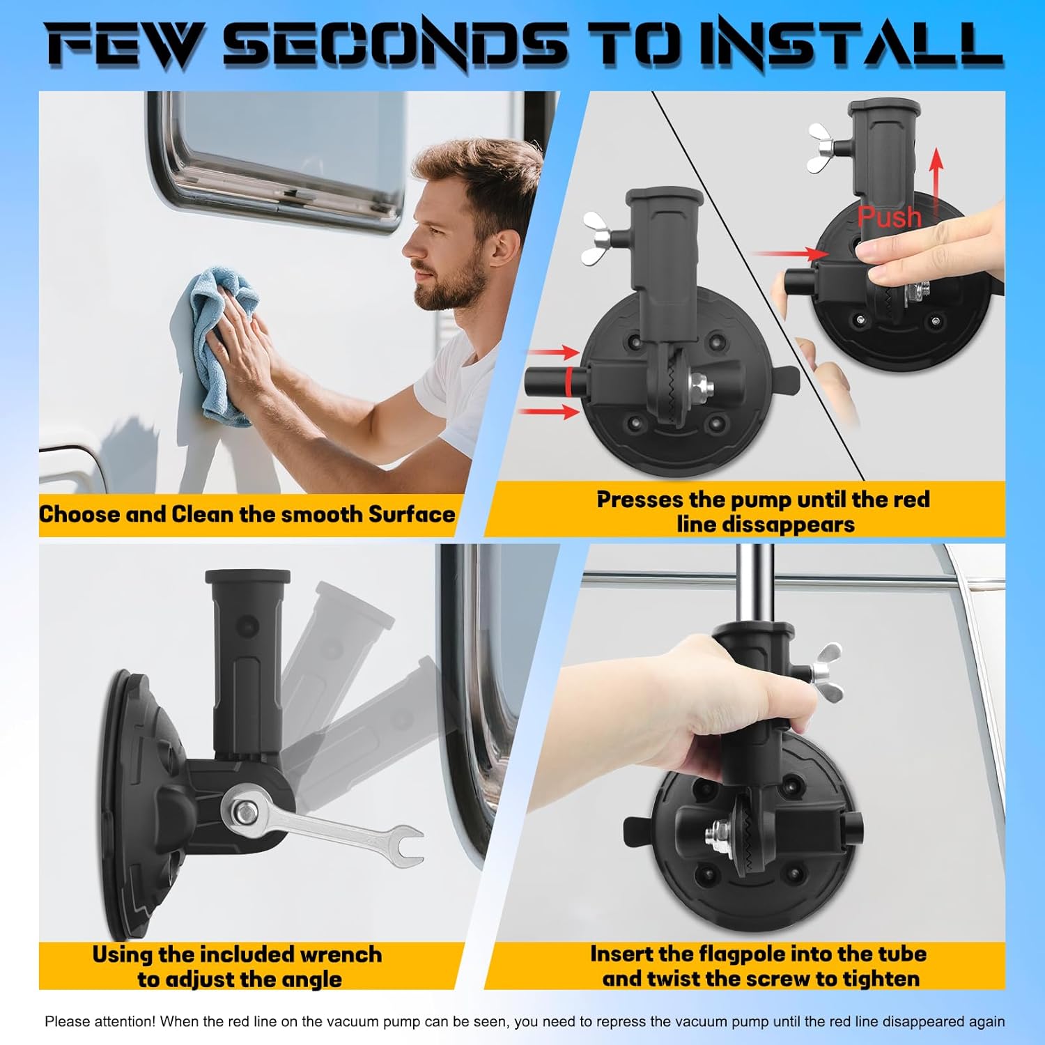 - Upgraded Vacuum Pump Design: Built with double layered air chamber provide a strong grip, the suction force of rv flag pole holder is super strong and holds well at highway speeds. The suction pump makes it super easy to install without drilling or placing mounts. Warning line design lets you know when it is secure.