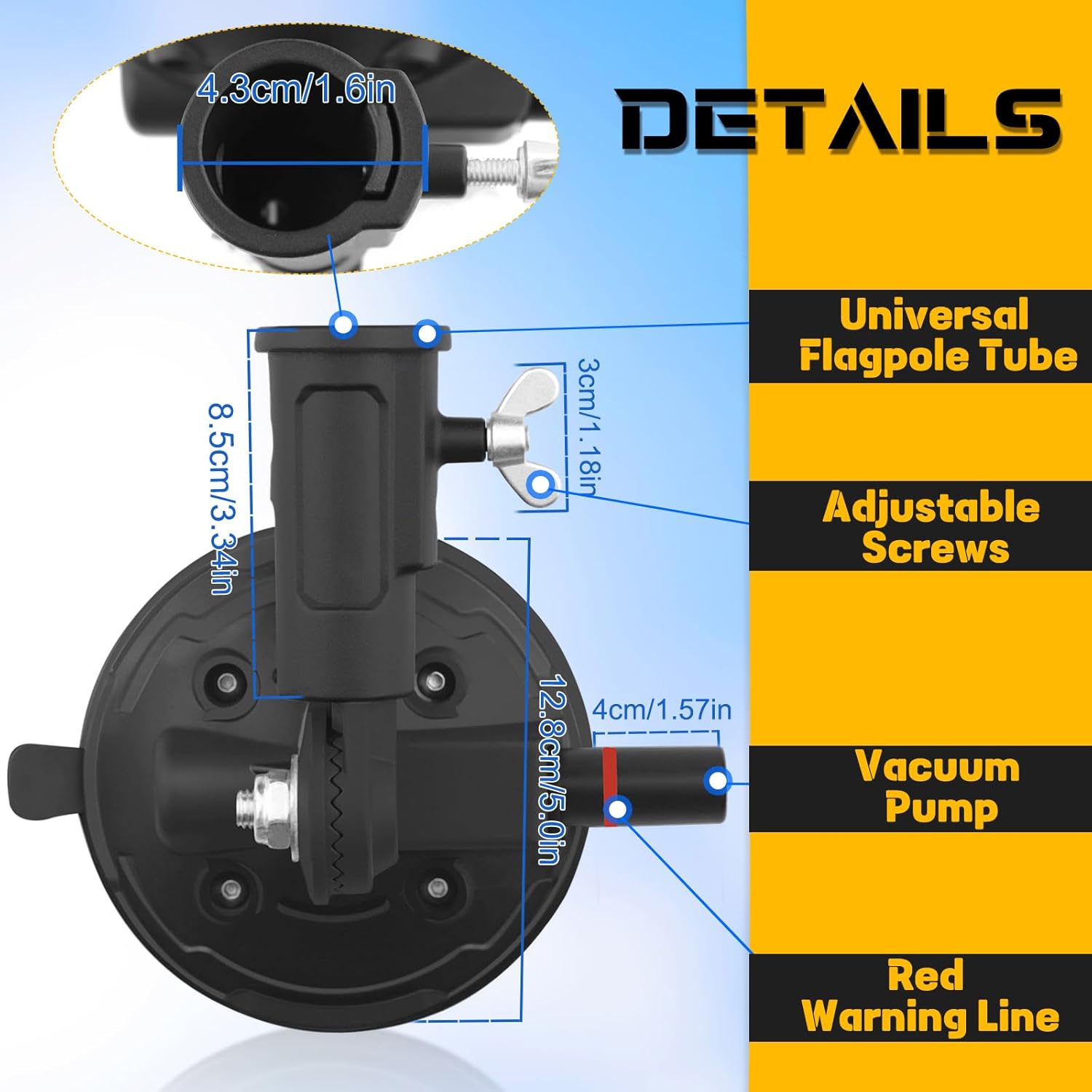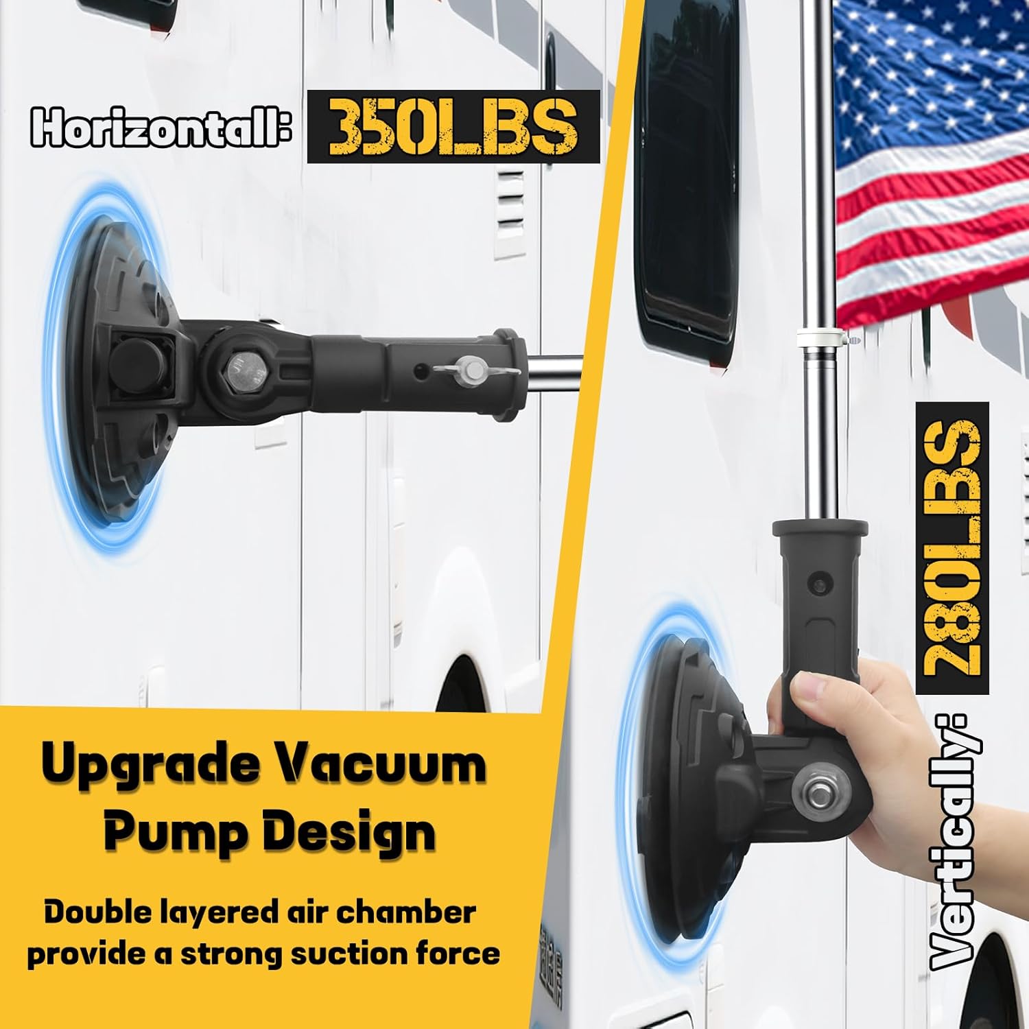 - Upgraded Vacuum Pump Design: Built with double layered air chamber provide a strong grip, the suction force of rv flag pole holder is super strong and holds well at highway speeds. The suction pump makes it super easy to install without drilling or placing mounts. Warning line design lets you know when it is secure.