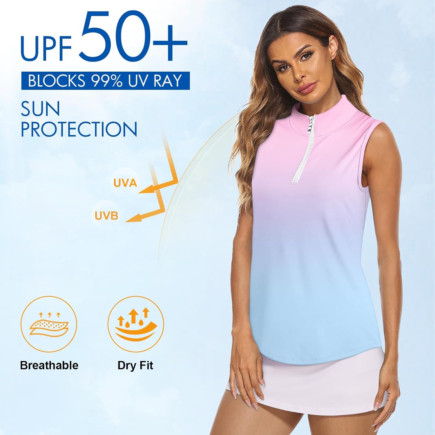 - Half Zipper Collar - Stand out from the crowd with our stand collar, sleeveless, v neck golf tank top. Half zip design allows for neck coverage, venting and easy on-off.