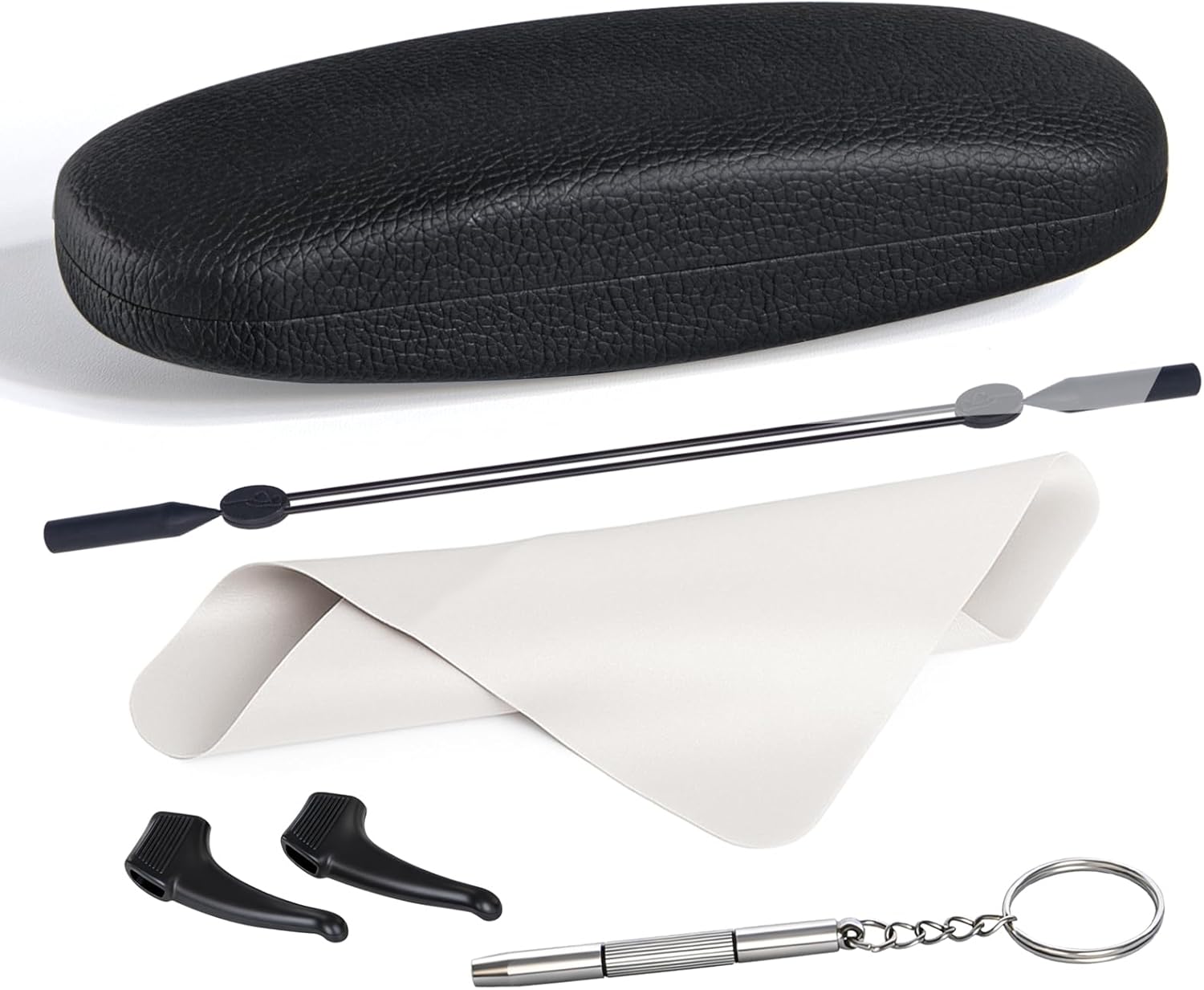 - Combination Device: Glasses necessary accessories includes 1 pack hard shell glasses case, 1 pcs of glasses cleaning cloth, 1 pcs anti-slip adjustable glasses strap, 1 pair small silicone ear grips hook, 1 pack mini screwdriver, these glasses accessories will bring you a surprising experience